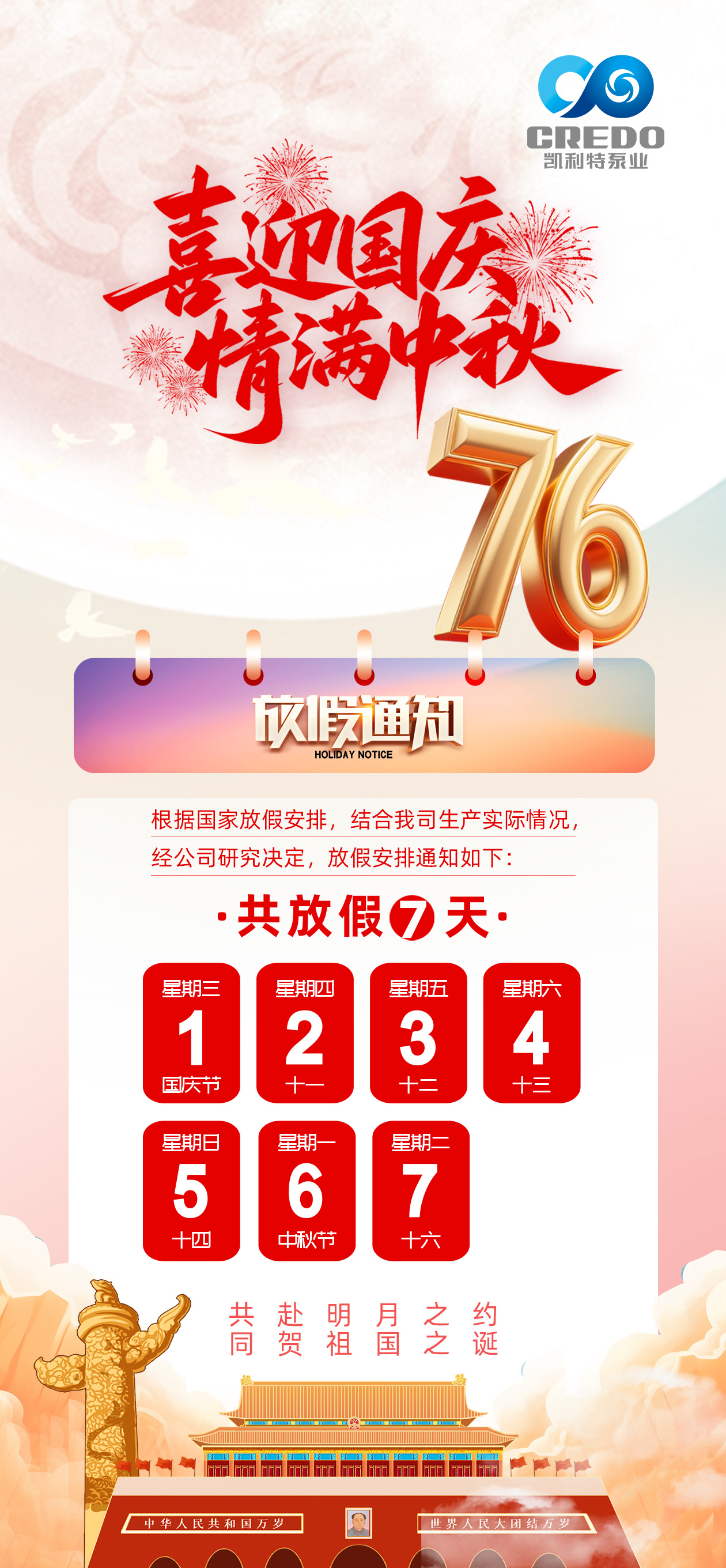 您好!感谢您一直以来对我司的信任与支持。值此国庆、中秋双节来临之际,根据国家法定节假日安排并结合公司实际情况,我司放假时间如下: